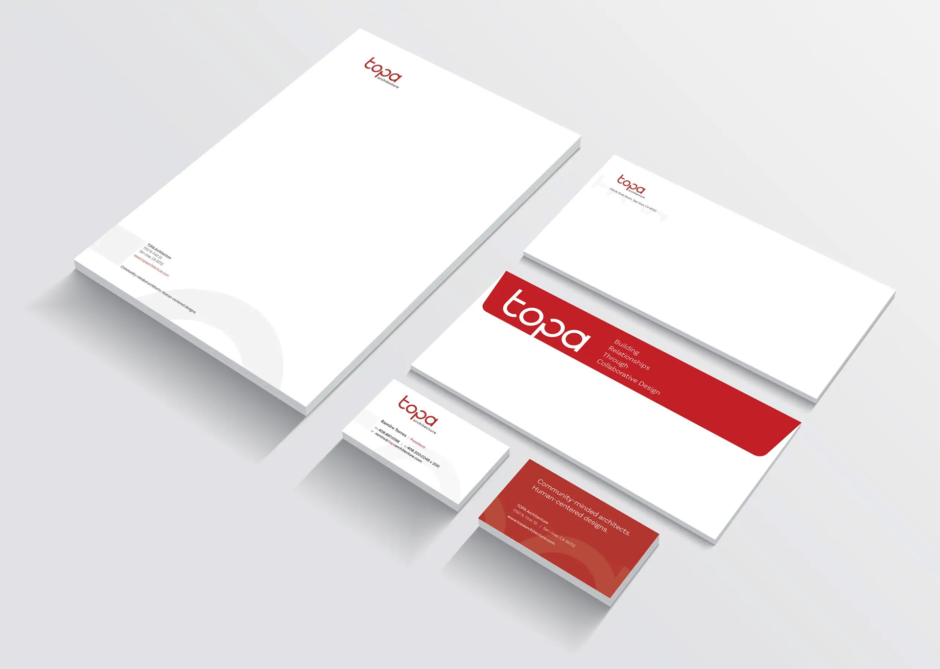 The logo was designed to reflect TOPA architecture’s energetic and colorful personality. In addition, the combination of modern typography and a rich and bright palette reflects TOPA’s current outlook and its involvement in the local Latino community.
