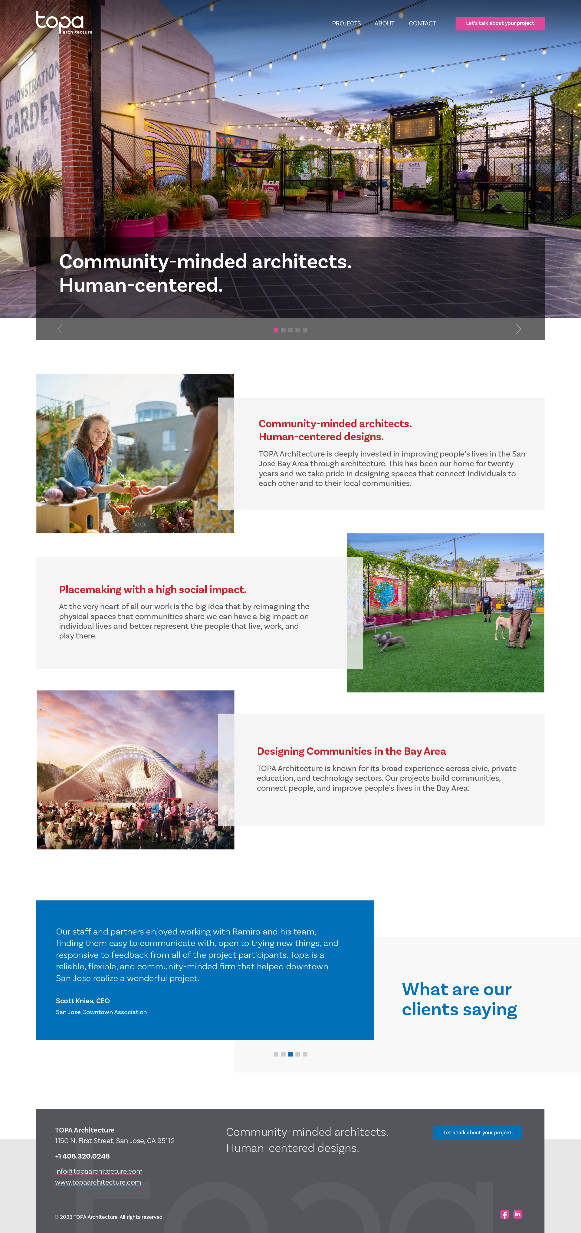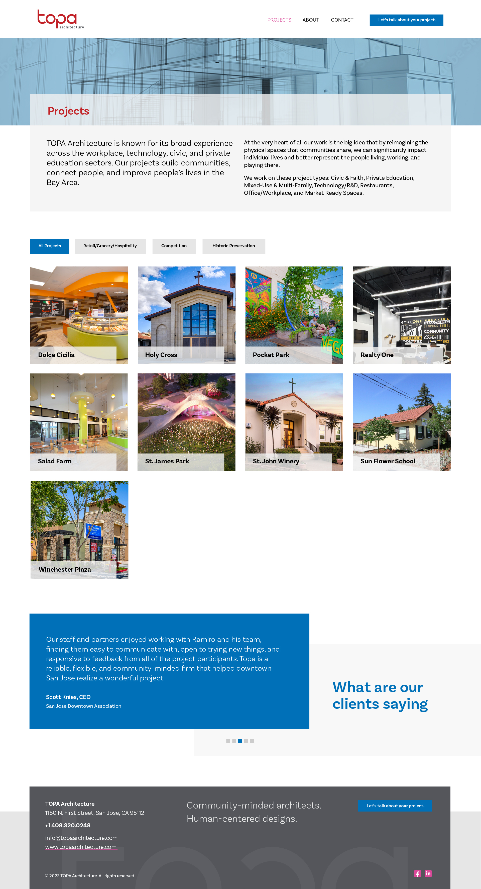 TOPA Architecture is a full-service architectural design firm based in San Jose. Engaged with local Latino markets, TOPA is involved in faith and civic organizations and community and education spaces. TOPA Architecture is known for its broad experience across the workplace, civic, and private education sectors.